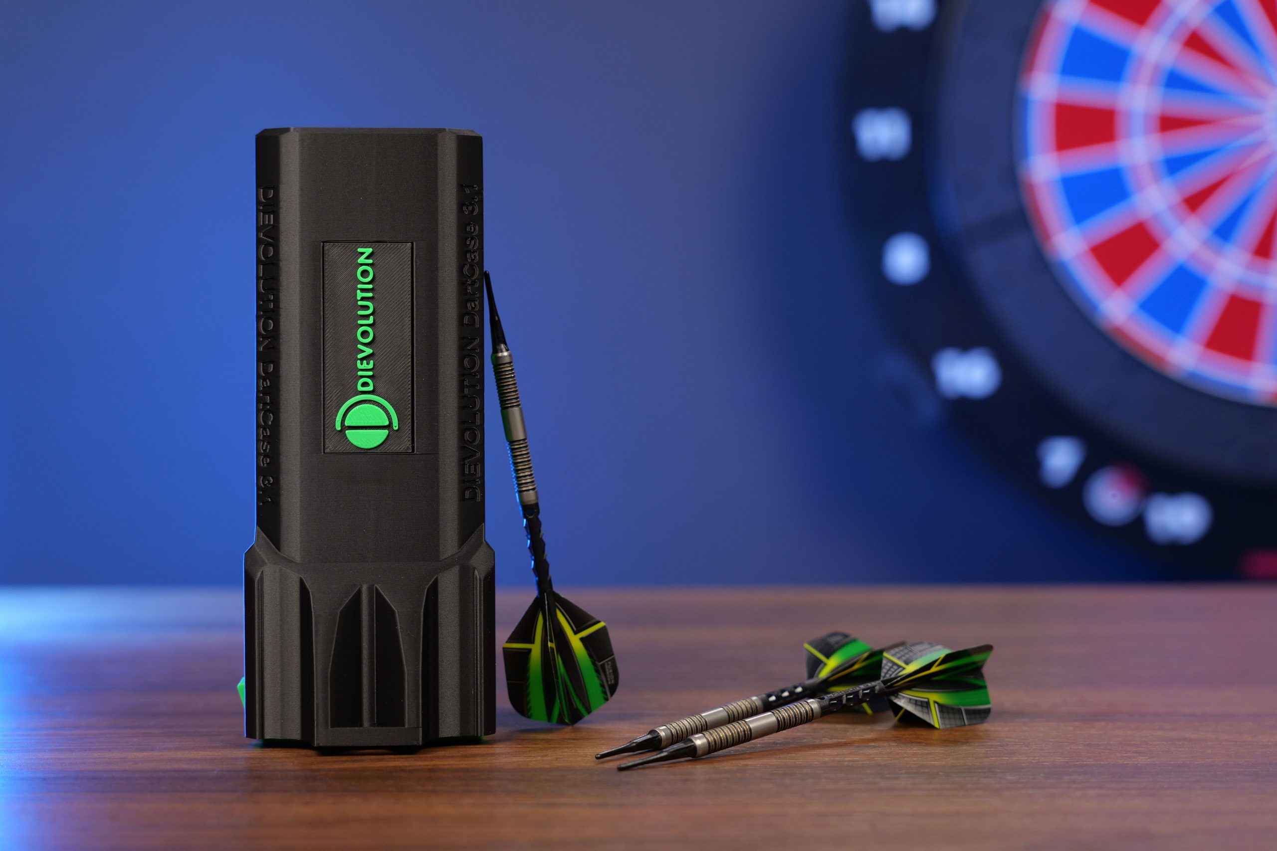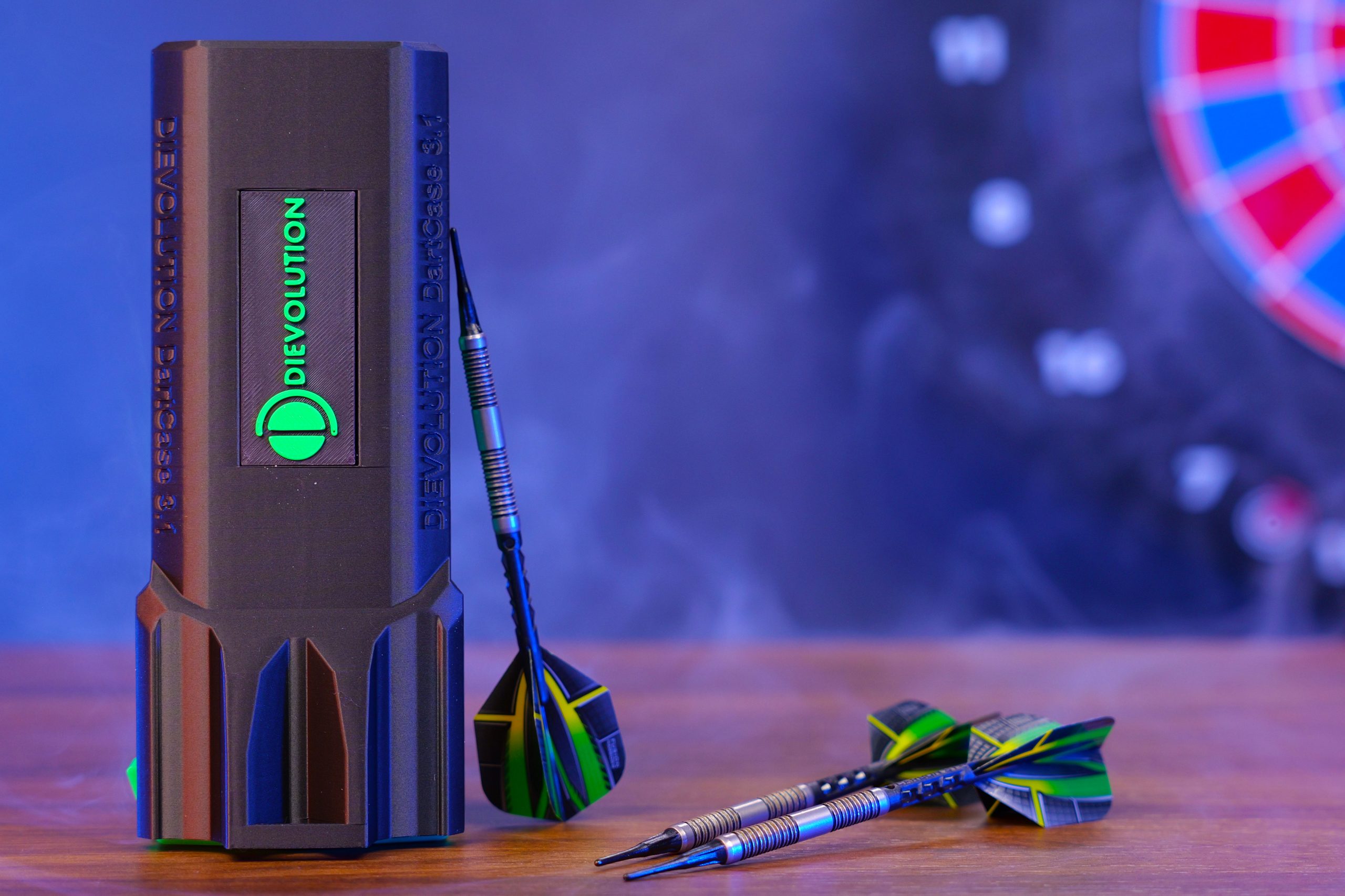 Entdecke das kompakte DIEVOLUTION DartCase 3.0 für 3 Darts und Zubehör – personalisierbar mit Namen oder Logo